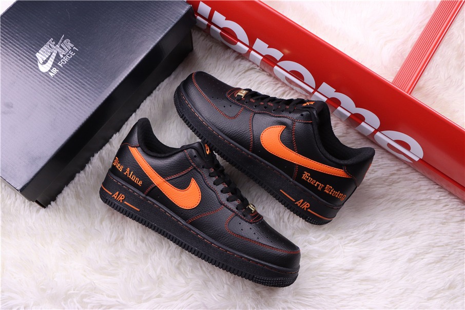 The Air Force 1 Low VLONE (2017) features a sleek black leather upper with bold orange VLONE branding and a distinctive embossed heel tab message. Combining Nike’s classic design with VLONE’s streetwear style, this sneaker is perfect for collectors and fashion enthusiasts.