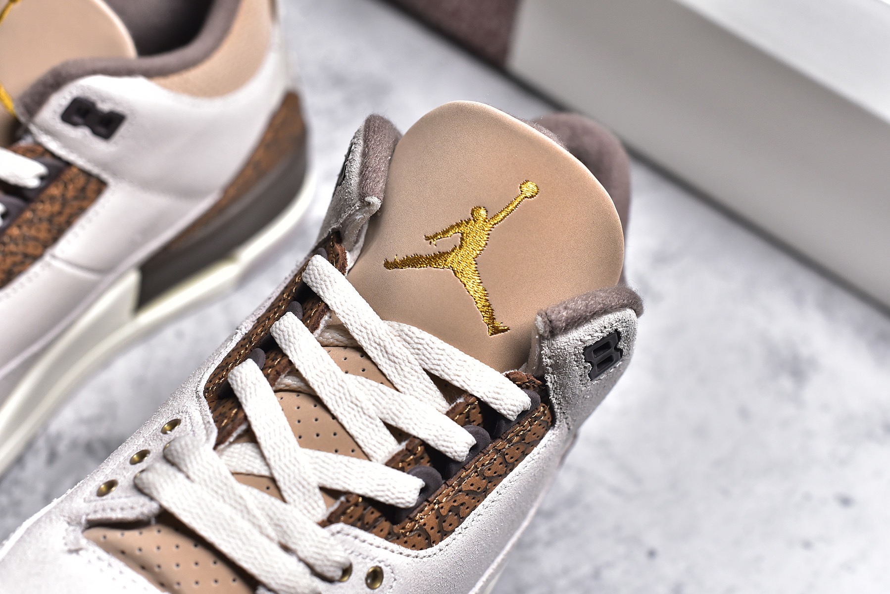 The Air Jordan 3 Retro ‘Palomino’ features a brown leather upper with classic elephant print overlays for a warm look. Includes light brown and tan accents, padded collar, visible Air-Sole unit, and durable rubber outsole. Perfect for sneaker enthusiasts.