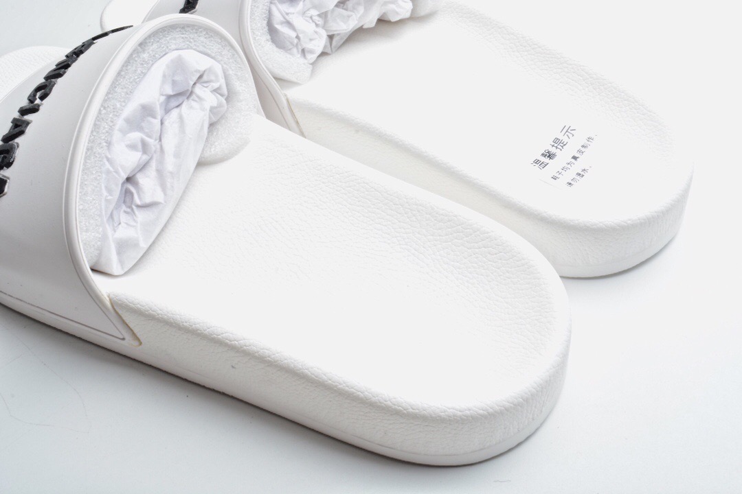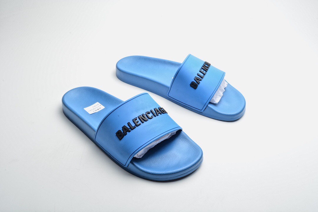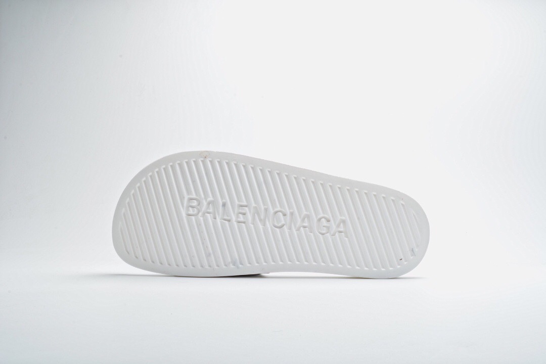 The Balenciaga Logo Pool Slides 2020SS feature a sleek design with a prominent logo and durable synthetic strap. Includes a molded footbed for comfort and a lightweight rubber outsole for flexibility. Ideal for casual wear and poolside lounging.