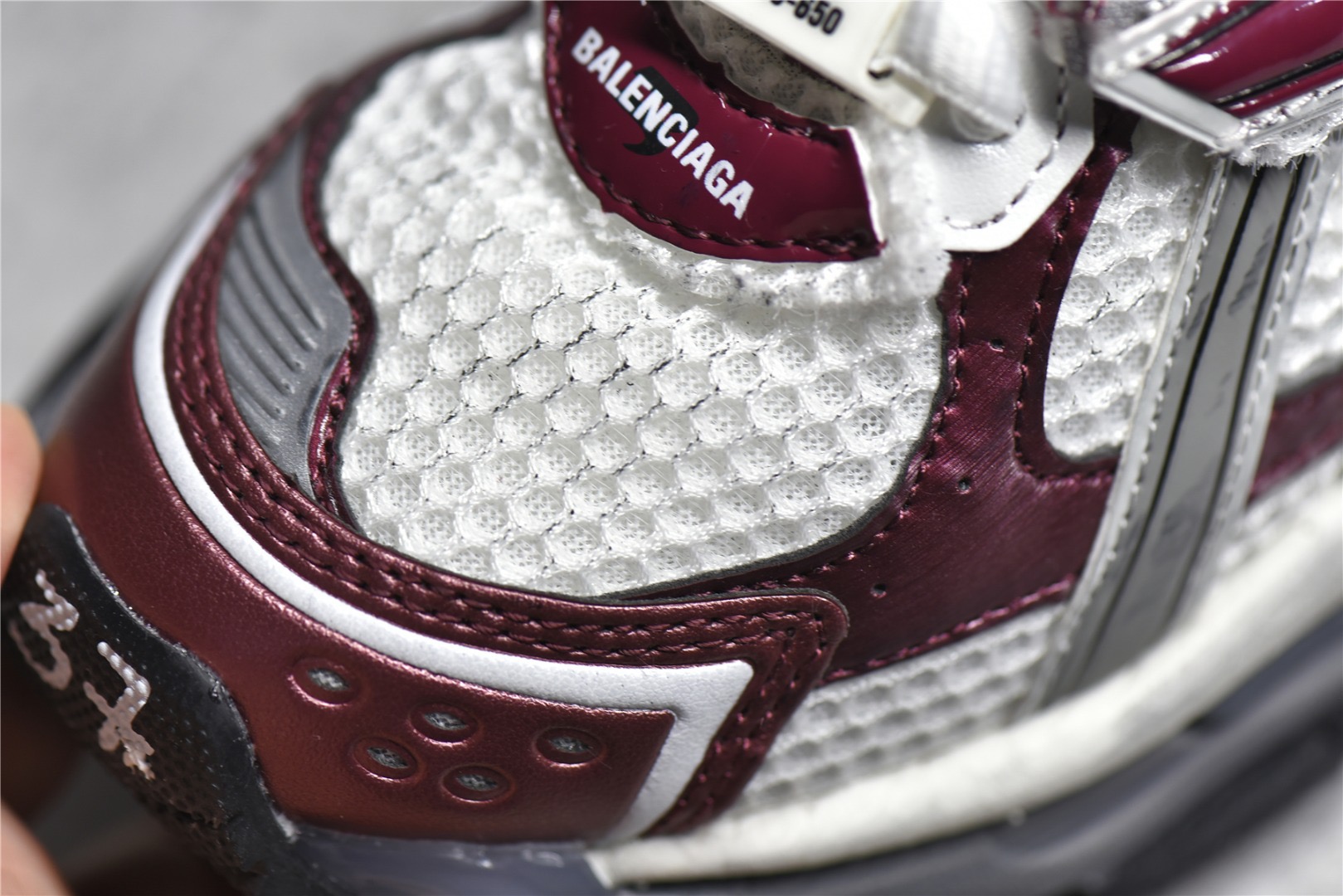 The Balenciaga Runner Sneaker in Burgundy features a breathable mesh upper, cushioned midsole, and durable rubber outsole, combining style and comfort for everyday wear.