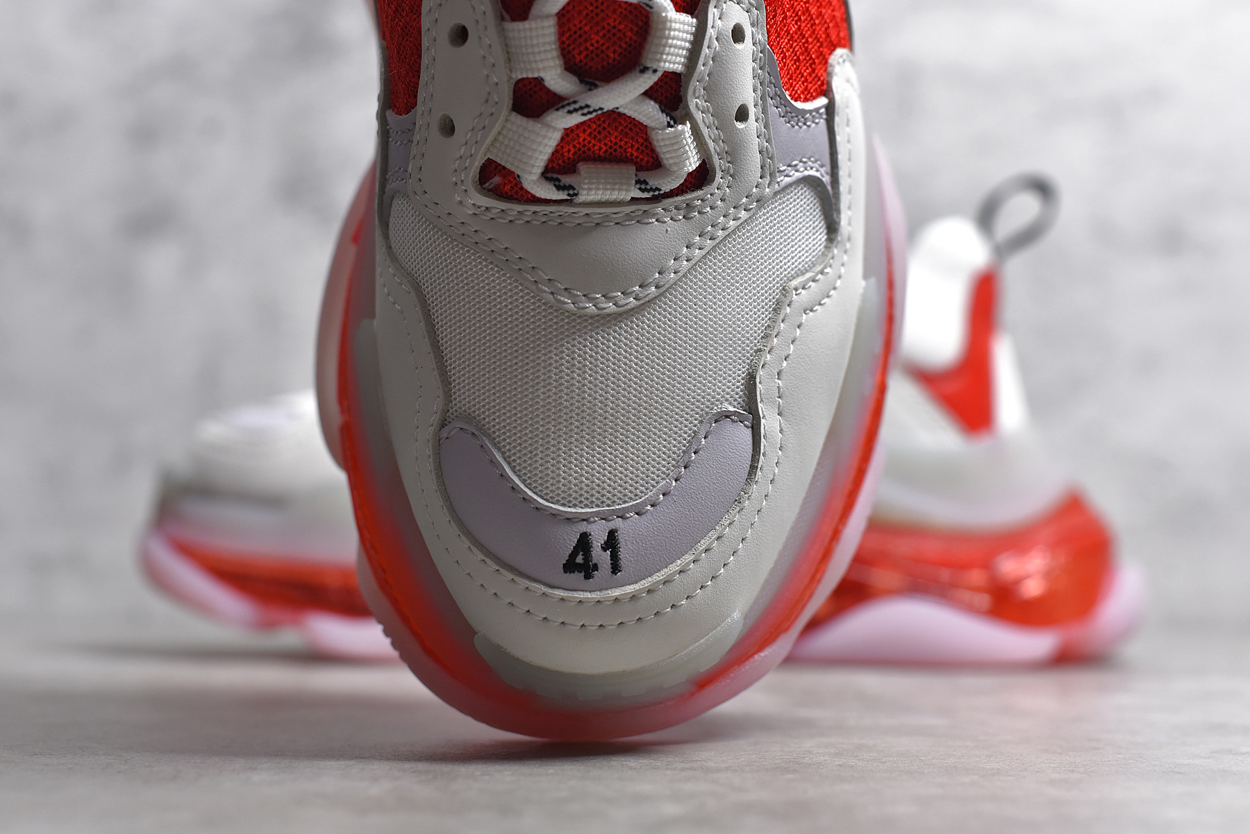 The Balenciaga Triple S Clear Sole WhiteRed features clean white and vibrant red tones with a clear sole for a stylish, modern look. Includes mesh and leather upper, clear sole, padded collar, and chunky rubber sole. Perfect for sneaker enthusiasts.