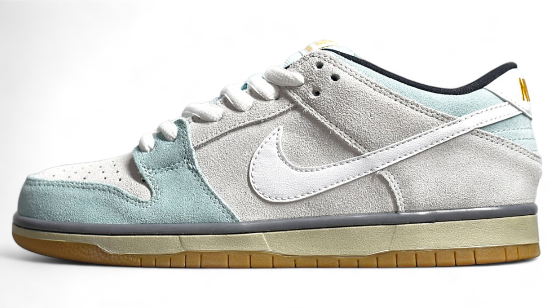 The Dunk Low Coast DD1503-100 features a white and coast blue colorway with university gold accents, combining premium leather materials for a luxurious feel. This sneaker offers Nike branding, a padded tongue and collar, traditional foam midsole, and durable rubber outsole for comfort and performance.