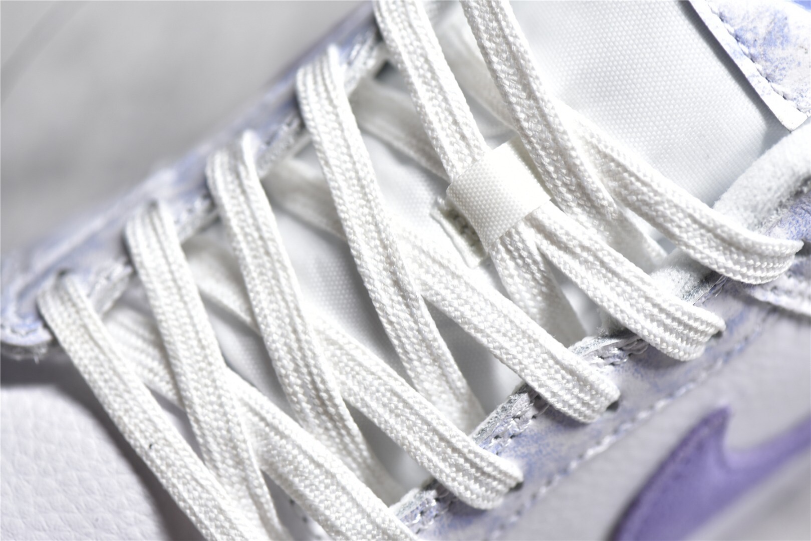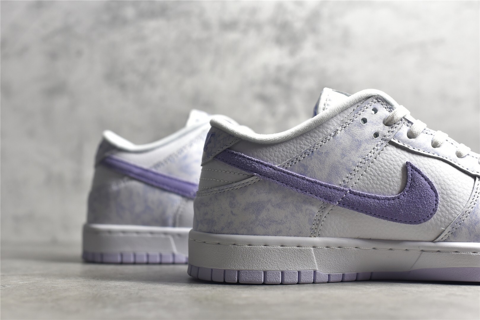 The Dunk Low Purple Pulse DM9467-500 features a tie-dye-inspired purple suede overlay on a white leather base, complemented by a white Nike Swoosh. This sneaker includes a speckled midsole and purple accents on the tongue and heel tab. It offers a padded tongue and collar, traditional foam midsole, and durable rubber outsole for comfort and performance.