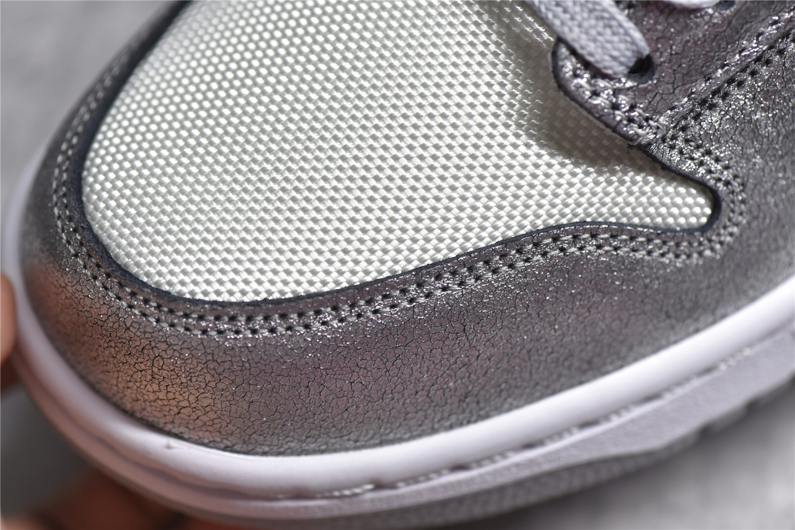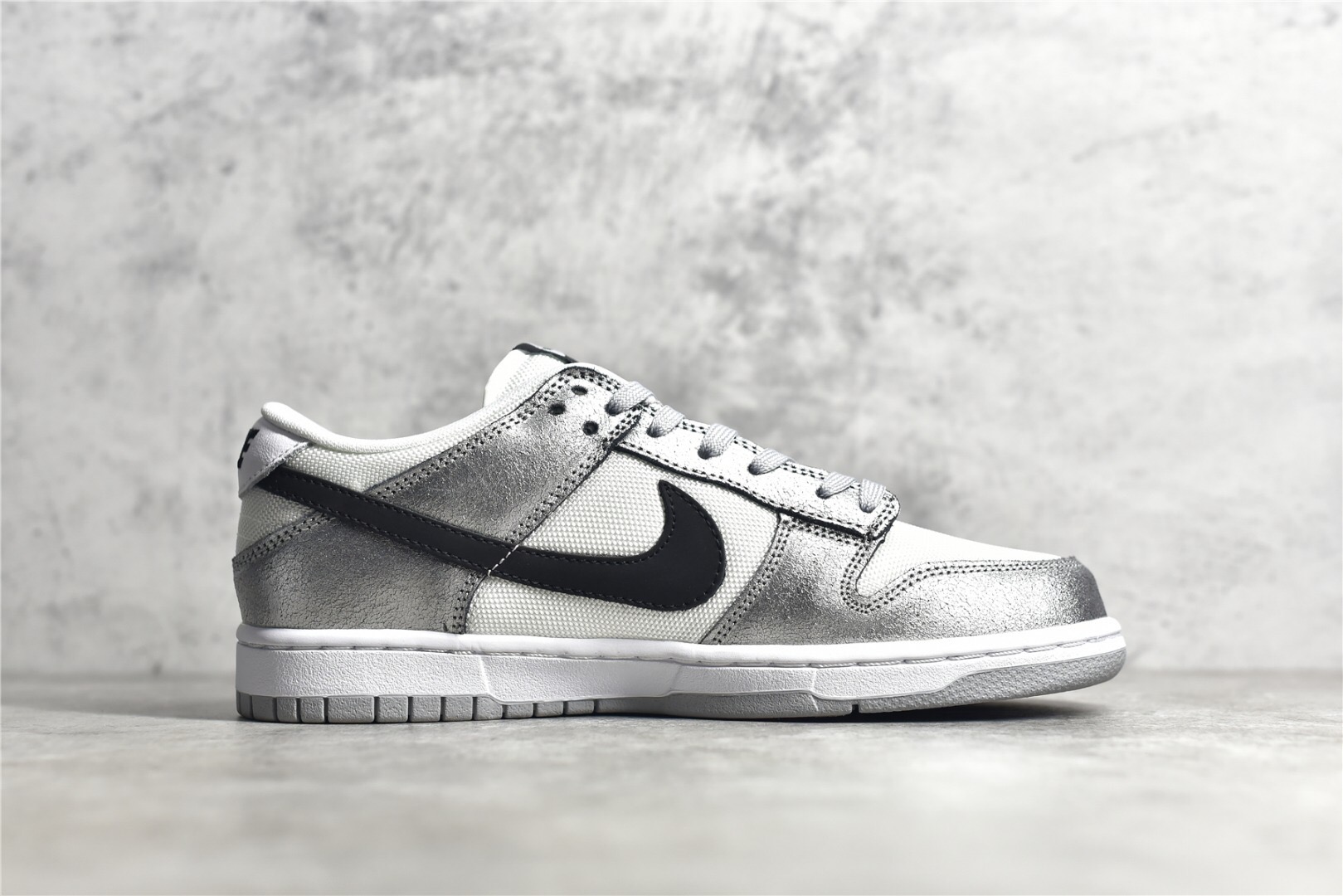 The Dunk Low Shimmer DO5882-001 features a black and metallic silver colorway with shimmer accents, combining premium leather and synthetic materials for a luxurious feel. This sneaker offers Nike branding, a padded tongue and collar, traditional foam midsole, and durable rubber outsole for comfort and performance.