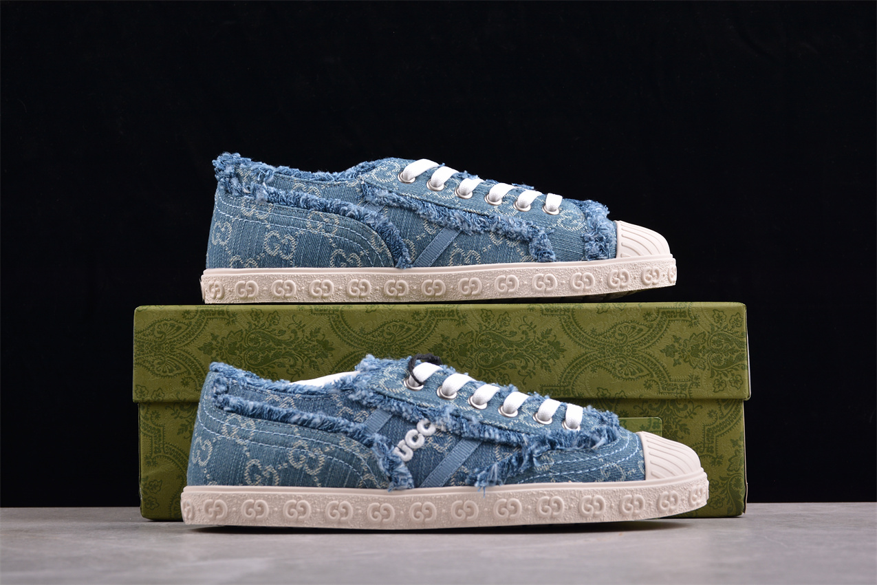 The Gucci GG Distressed Denim Sneaker features the iconic GG pattern on distressed denim, leather trim, signature web stripe, and a rubber sole. Perfect for combining a trendy vintage look with modern luxury.