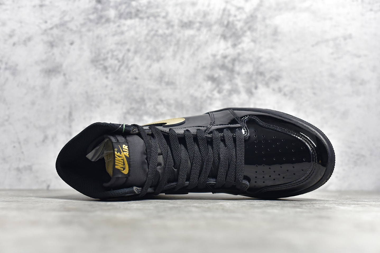 The Jordan 1 Retro High Black Metallic Gold features a glossy black patent leather upper with striking metallic gold accents. Its luxurious design, with a white midsole and black outsole, makes it a standout addition to any sneaker collection.