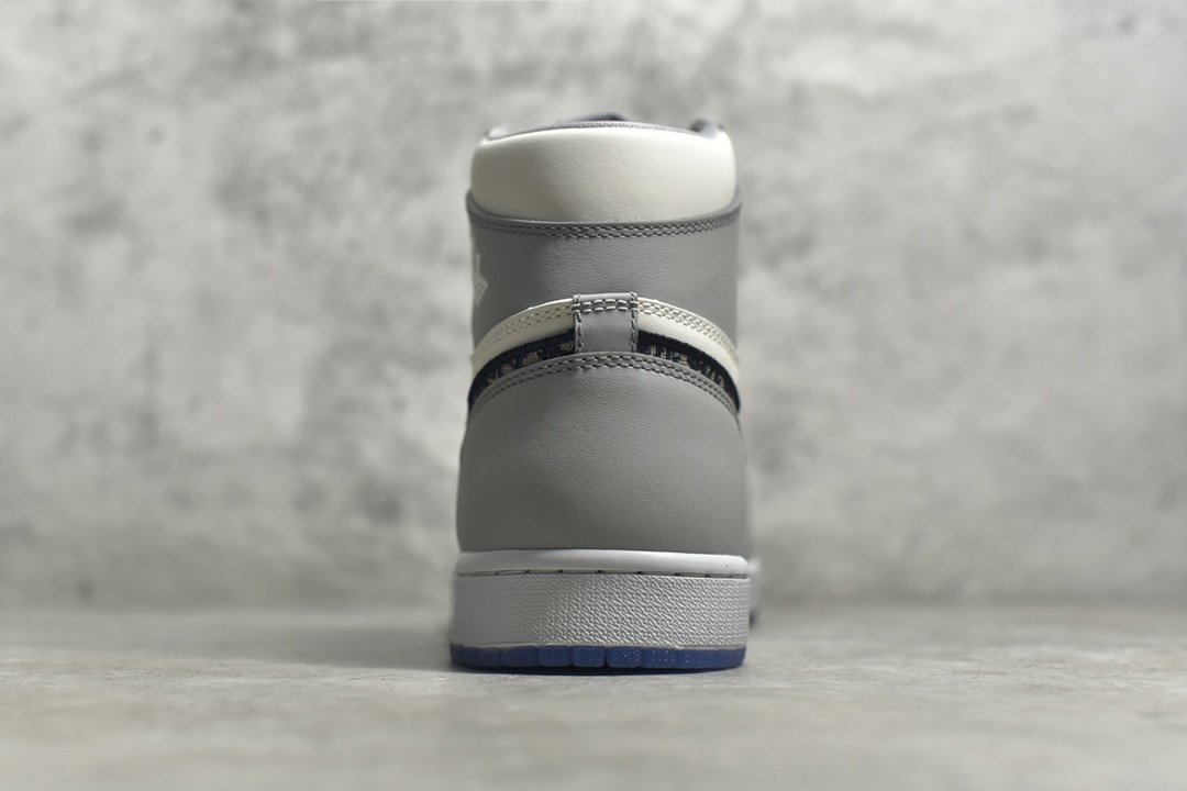 The Dior x Air Jordan 1 High combines white and gray leather with Dior’s monogram accents for a classic look. Features breathable mesh, padded collar, visible Air-Sole unit, and durable rubber outsole. Ideal for sneaker enthusiasts.