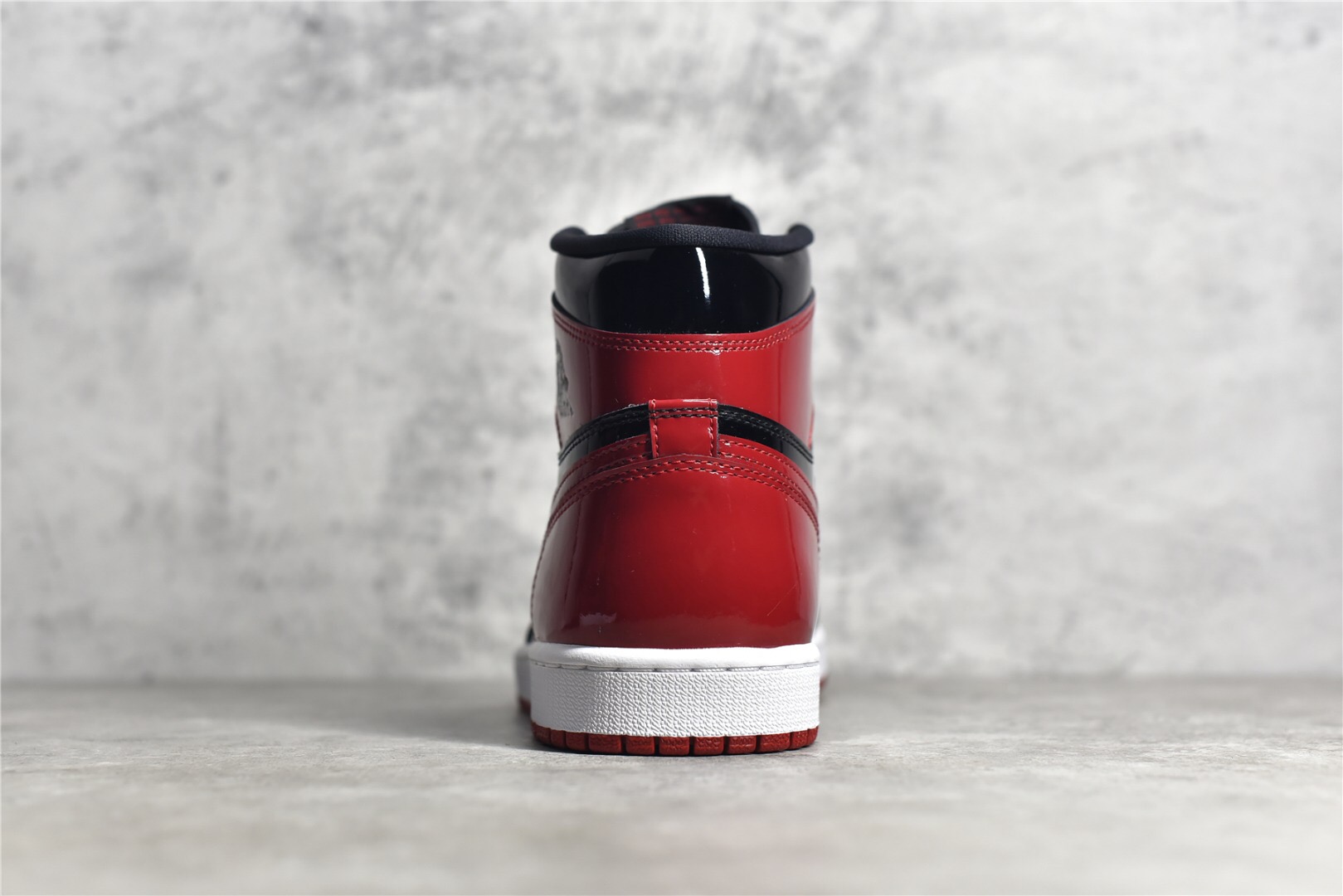 The Jordan 1 Retro High OG Patent Bred features a glossy black patent leather upper with red accents, Nike Air branding, and a full-length Air-Sole unit for comfort and style. Ideal for sneaker enthusiasts and collectors seeking a luxurious twist on a classic silhouette.
