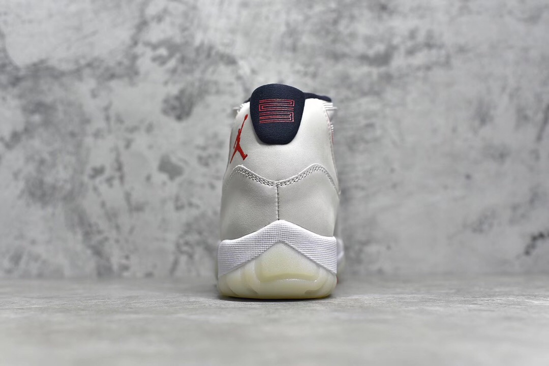 The Jordan 11 Retro AJ11-Platinum Tint features a sophisticated Platinum Tint upper with Sail and University Red accents, patent leather mudguard, padded collar, responsive Air-Sole unit, and durable rubber outsole. A stylish and versatile choice for sneaker enthusiasts seeking both elegance and comfort.