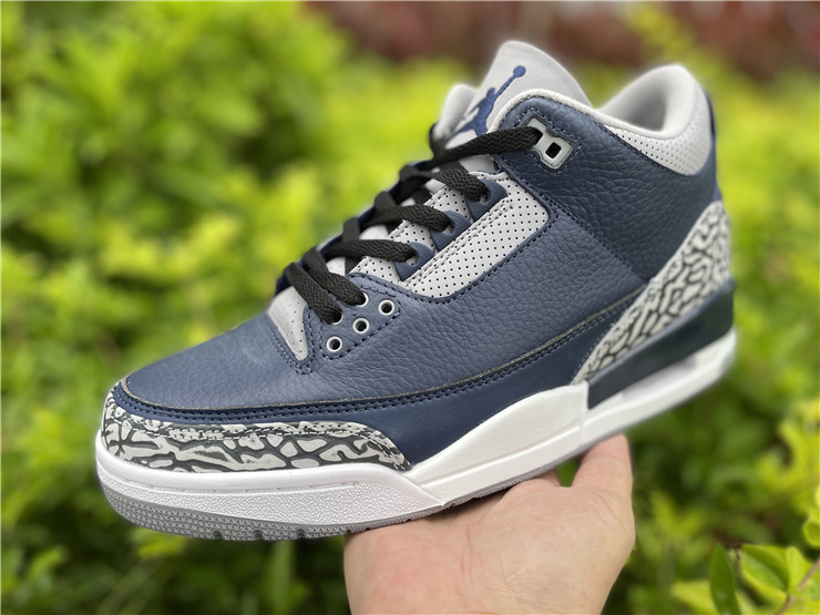 The Jordan 3 Retro Army Blue features an army blue leather upper, perforated panels, padded collar, visible Air-Sole unit, and durable rubber outsole. Offering a rugged and distinctive design, this pair is a stylish choice for sneaker enthusiasts seeking both boldness and comfort.