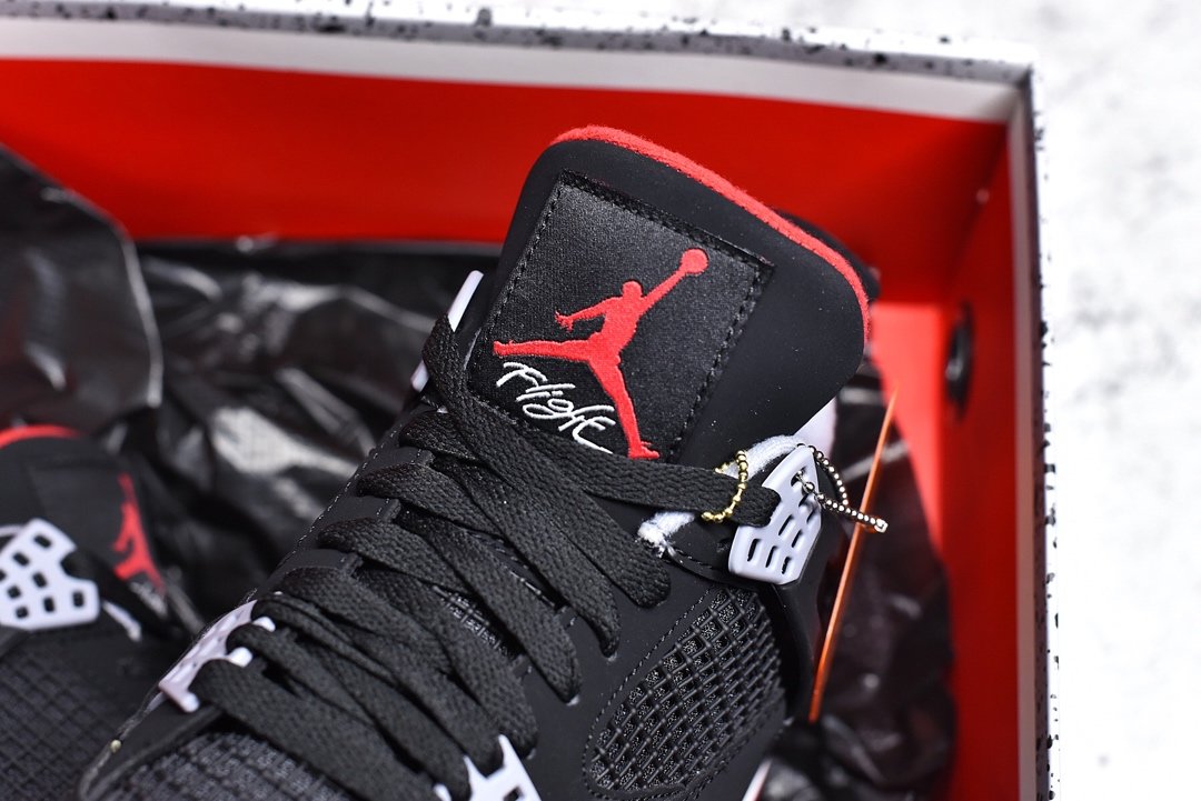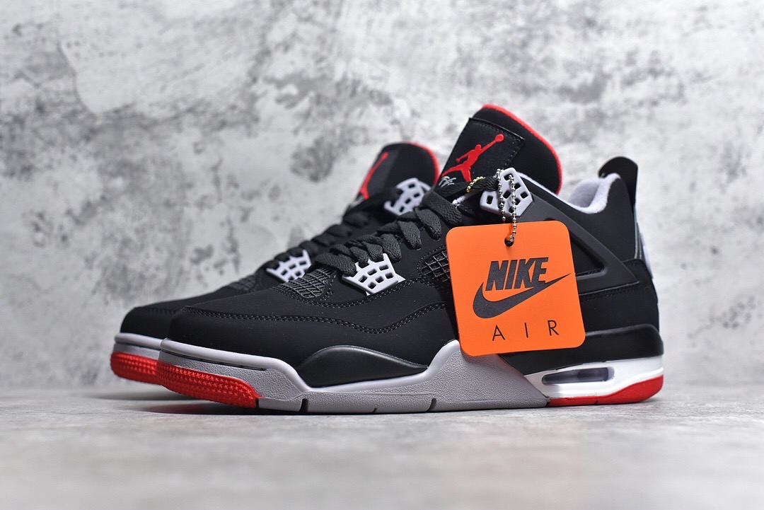 The Jordan 4 Retro Bred features a black nubuck upper with red accents, breathable mesh, a supportive midfoot strap, and a visible Air-Sole unit. A timeless classic for sneaker enthusiasts.