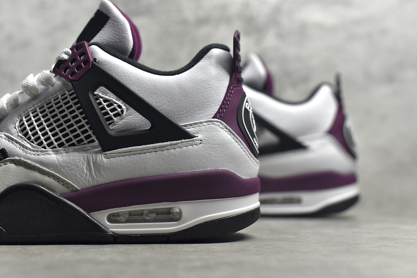 The Jordan 4 Retro PSG Paris Saint-Germain features a white leather upper with Bordeaux and black accents, PSG branding, breathable mesh, a supportive midfoot strap, and a visible Air-Sole unit. It’s a must-have for sneaker enthusiasts and football fans.