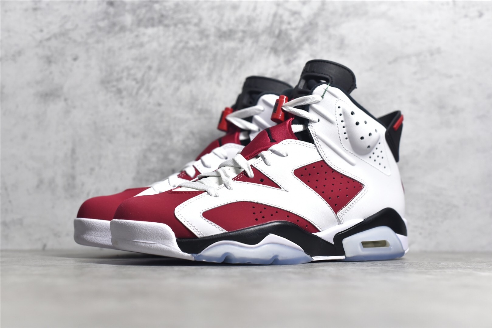 The Jordan 6 Retro Carmine features a bold white leather and carmine red nubuck upper, perforated panels, padded collar, visible Air-Sole unit, and durable rubber outsole. A vibrant and iconic choice for sneaker enthusiasts seeking both style and performance.