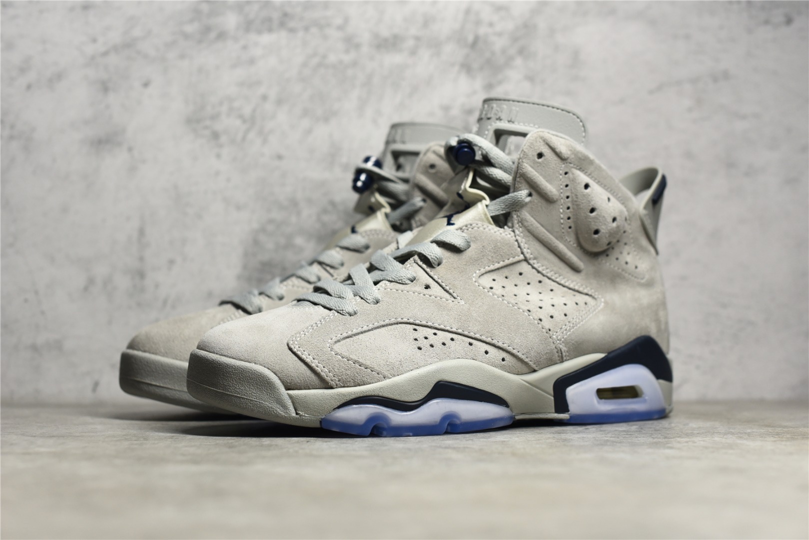The Jordan 6 Retro Georgetown features a classic combination of grey suede and navy blue leather on the upper, perforated panels, padded collar, responsive Air-Sole unit, and durable rubber outsole. A stylish and timeless choice for sneaker enthusiasts celebrating Georgetown University heritage.