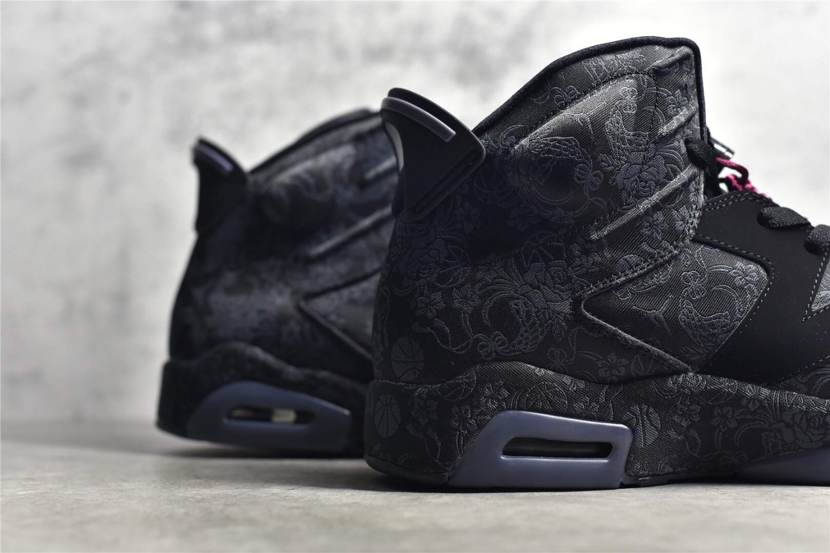 The Jordan 6 Retro Singles Day features a luxurious black suede upper with intricate floral patterns and metallic gold accents, perforated panels, padded collar, visible Air-Sole unit, and durable rubber outsole. A special edition celebrating Singles Day, perfect for sneaker enthusiasts seeking unique design and comfort.
