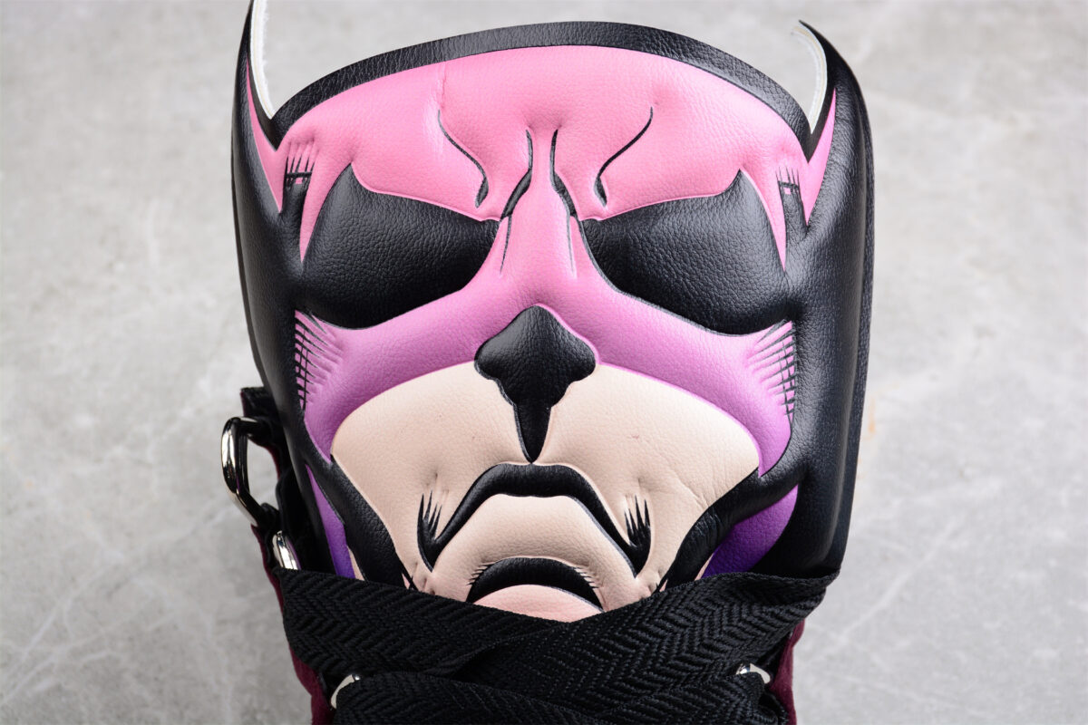 The Lanvin Curb Cartoon Sports Sneaker Purple Shoes features a purple leather and fabric upper with cartoon-inspired graphics, oversized laces, padded collar, and chunky rubber outsole. Perfect for those seeking a playful and stylish high-top sneaker with luxury appeal.