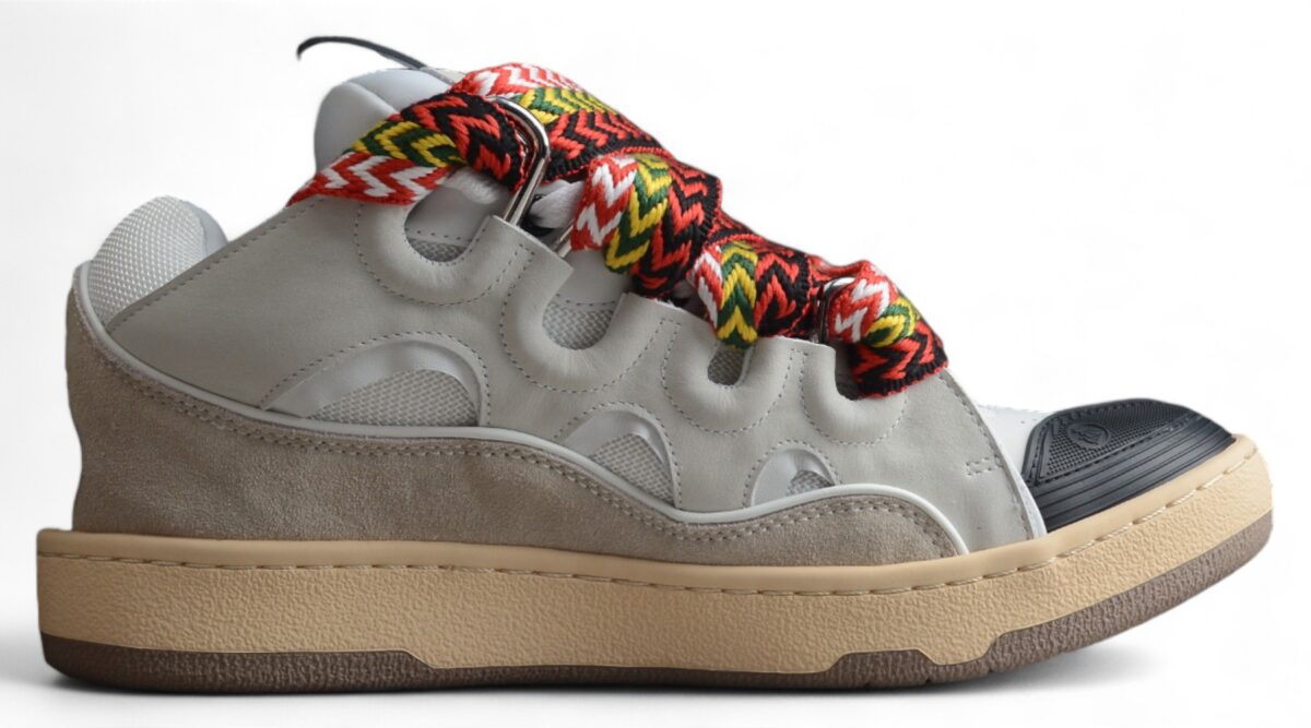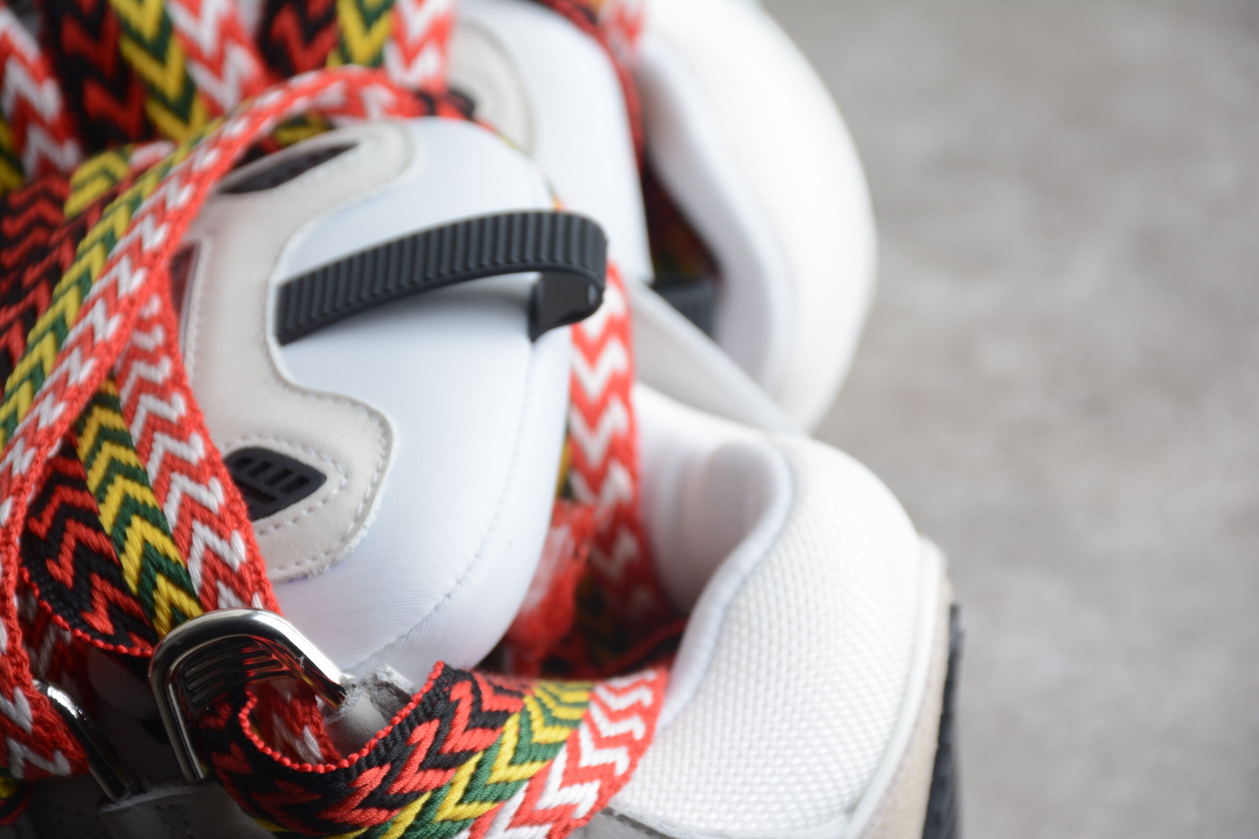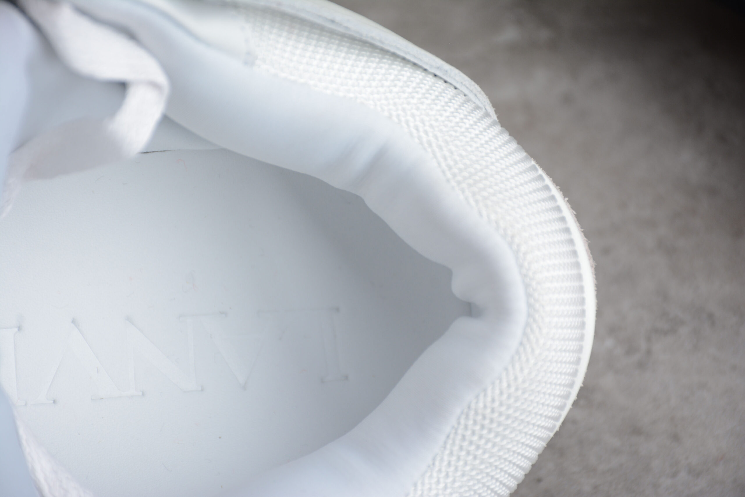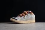 The Lanvin Leather Curb Sneakers in white and ivory feature a premium leather upper with elegant tones. Includes oversized laces, padded collar, cushioned insole, and durable rubber outsole. Perfect blend of sophistication and modern style.