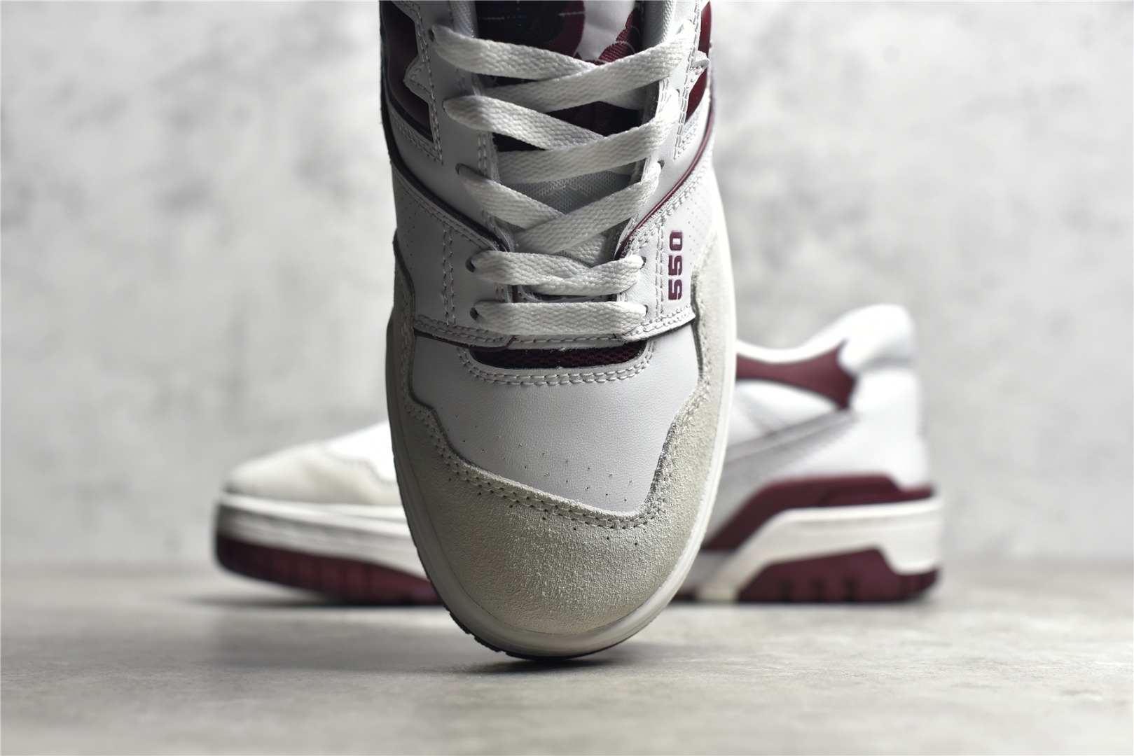 The NB BB550 012 combines white leather with black accents for a sleek look. Features perforated leather, padded collar, EVA midsole, and durable rubber outsole. Ideal for everyday wear.