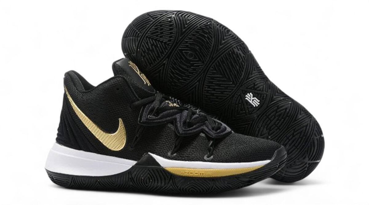 The Nike Kyrie 5 x Black Metallic Gold combines a sleek black upper with metallic gold accents. Features breathable mesh, padded collar, Zoom Turbo unit, and durable rubber outsole. Ideal for basketball enthusiasts.