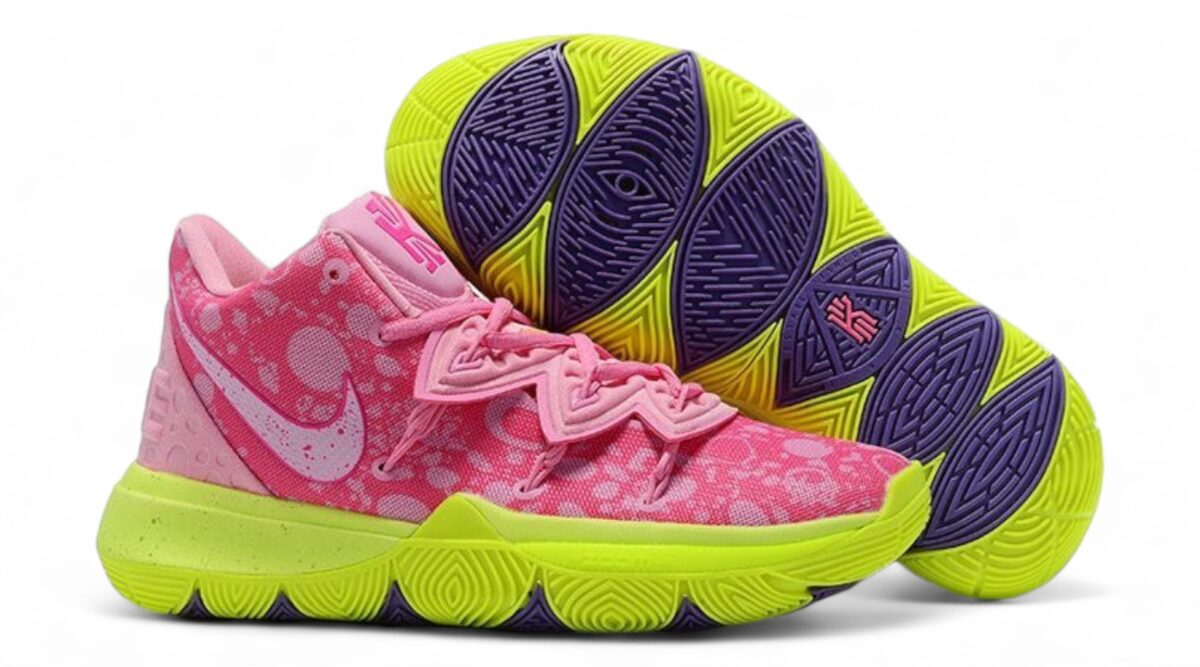 The NIKE KYRIE 5 x SPONGEBOB PATRICK features a playful pink and green design inspired by Patrick Star, crafted with premium materials for durability. Includes breathable mesh, padded collar, visible Air-Sole unit, and durable rubber outsole, perfect for Patrick fans.