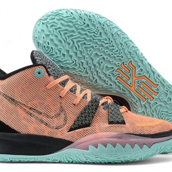 The Nike Kyrie 7 x Daybreak features a sky blue mesh upper with pink and orange accents, reflecting the hues of a sunrise. Includes a supportive midfoot cage, Zoom Air unit for responsive cushioning, and durable rubber outsole. Ideal for athletes and style lovers.