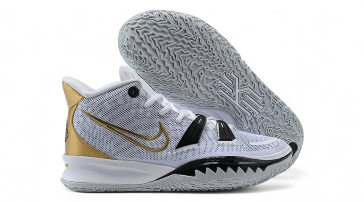 The Nike Kyrie 7 x NBA Final Rings features a gold mesh upper with black accents for a luxurious look. Includes an adaptive midfoot strap, Zoom Air unit for responsive cushioning, and durable rubber outsole. Ideal for basketball and style enthusiasts.