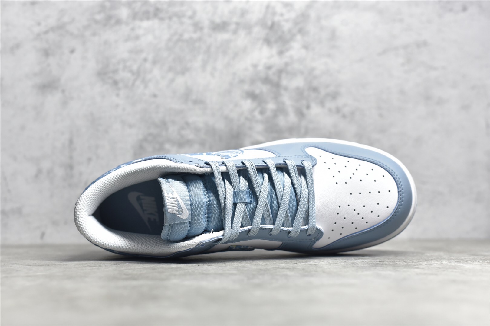 The NK Dunk Low Blue Paisley DH4401-101 combines white leather with blue paisley print accents for a fresh look. Features a perforated toe box, padded collar, foam midsole, and durable rubber outsole. Ideal for sneaker enthusiasts.