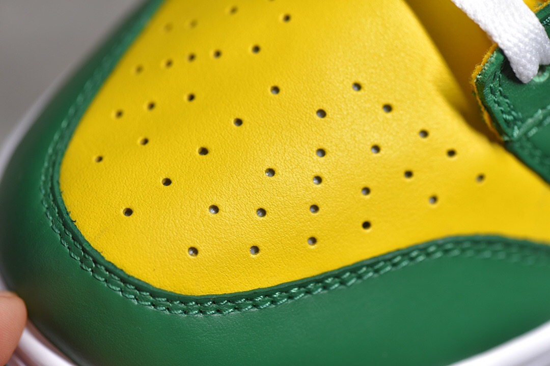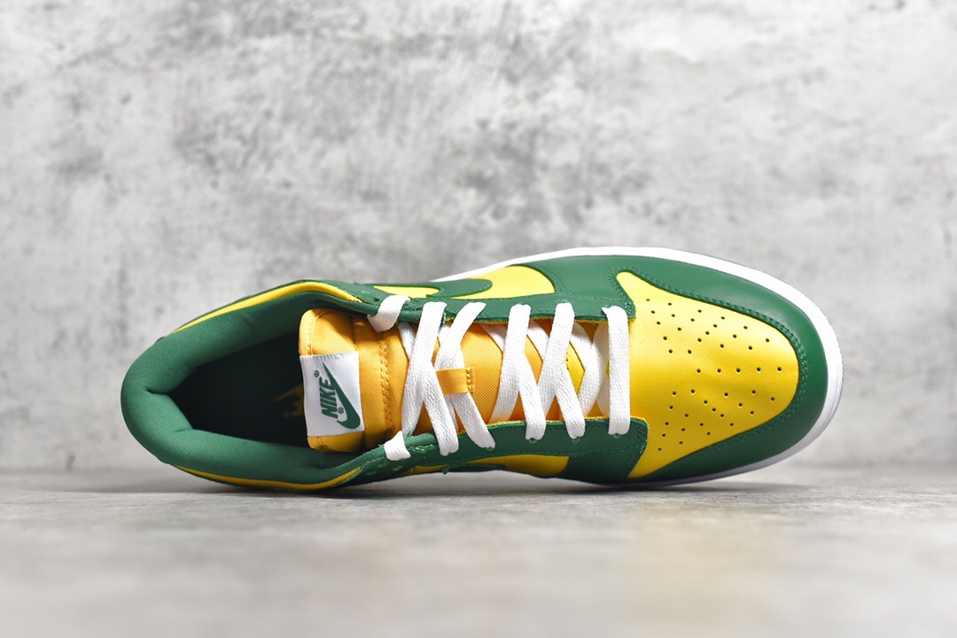The Dunk Low Brazil CU1727-700 showcases a varsity maize and pine green colorway, crafted from premium leather for a durable and stylish look. This sneaker features iconic Nike branding, a padded tongue and collar, traditional foam midsole, and a rubber outsole for traction and durability.