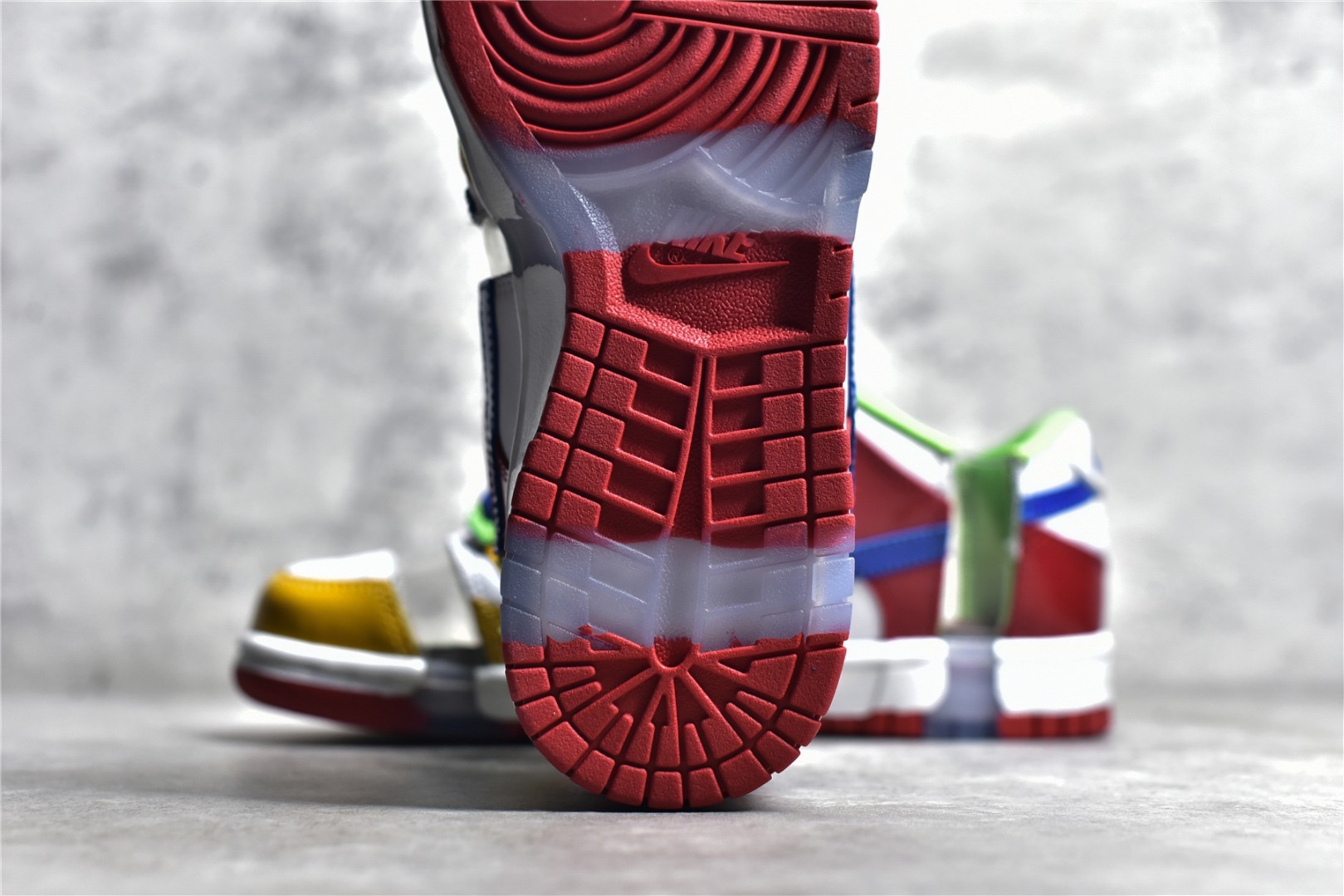 The NK SB Dunk Low eBay Sandy Bodecker FD8777-100 features a white leather and suede upper with eBay-themed colors and logo detailing. Includes padded collar, Zoom Air unit, and durable rubber outsole. Ideal for sneaker collectors and enthusiasts.