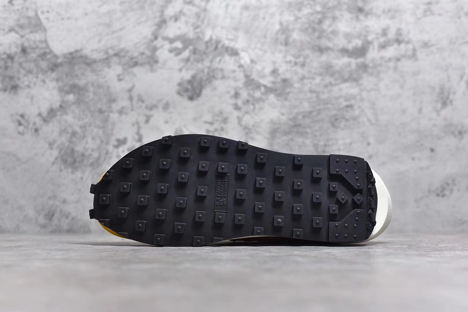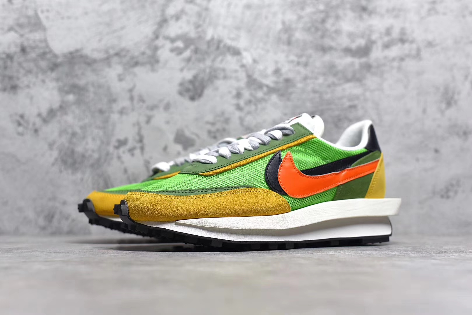 The Sacai LVD Waffle Daybreak – green yellow features a green and yellow suede upper with dual Swooshes and double tongues, crafted with premium materials for durability. Includes breathable mesh, padded collar, visible Air-Sole unit, and durable rubber outsole, perfect for collectors and sneaker aficionados.