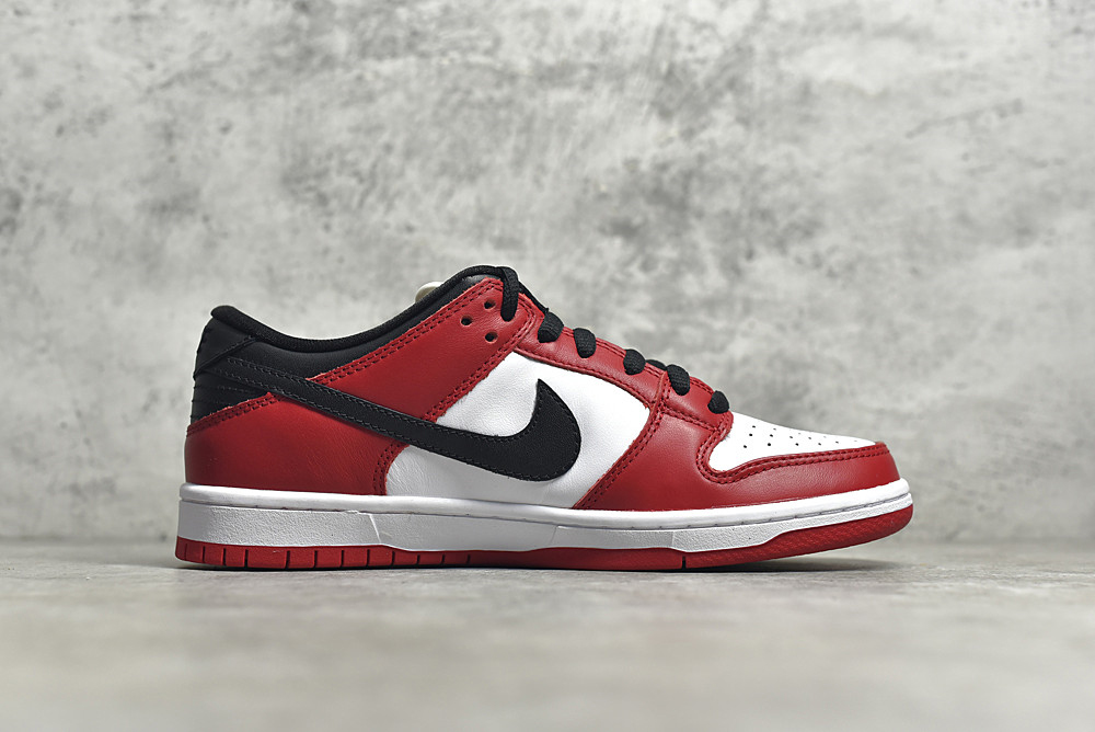 The SB Dunk Low J-Pack Chicago BQ6817-600 features a red, black, and white colorway, combining premium leather and suede materials for a high-quality feel. This sneaker offers Nike SB branding, a padded tongue and collar, Zoom Air cushioning, and a durable rubber outsole for comfort and performance.