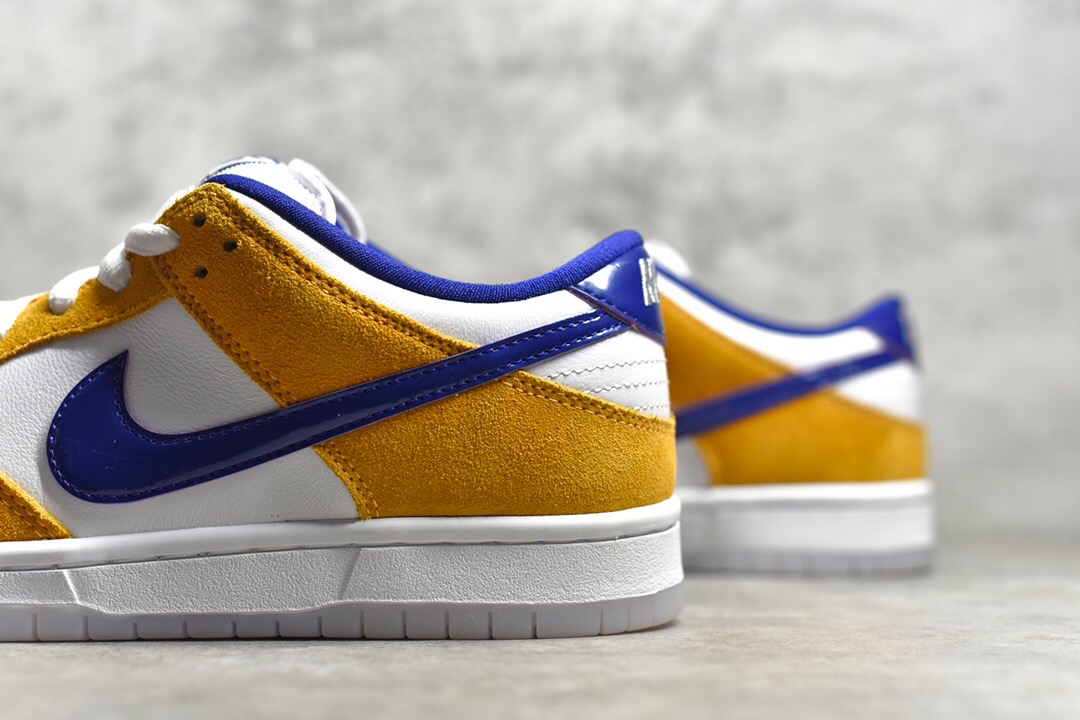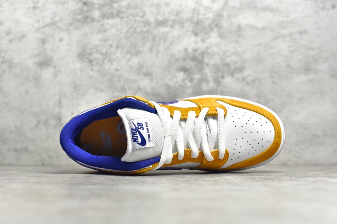 The SB Dunk Low Laser Orange features a laser orange, white, and purple colorway, combining premium leather and suede materials for a luxurious feel. This sneaker offers Nike SB branding, a padded tongue and collar, Zoom Air cushioning, and a durable rubber outsole for comfort and performance.