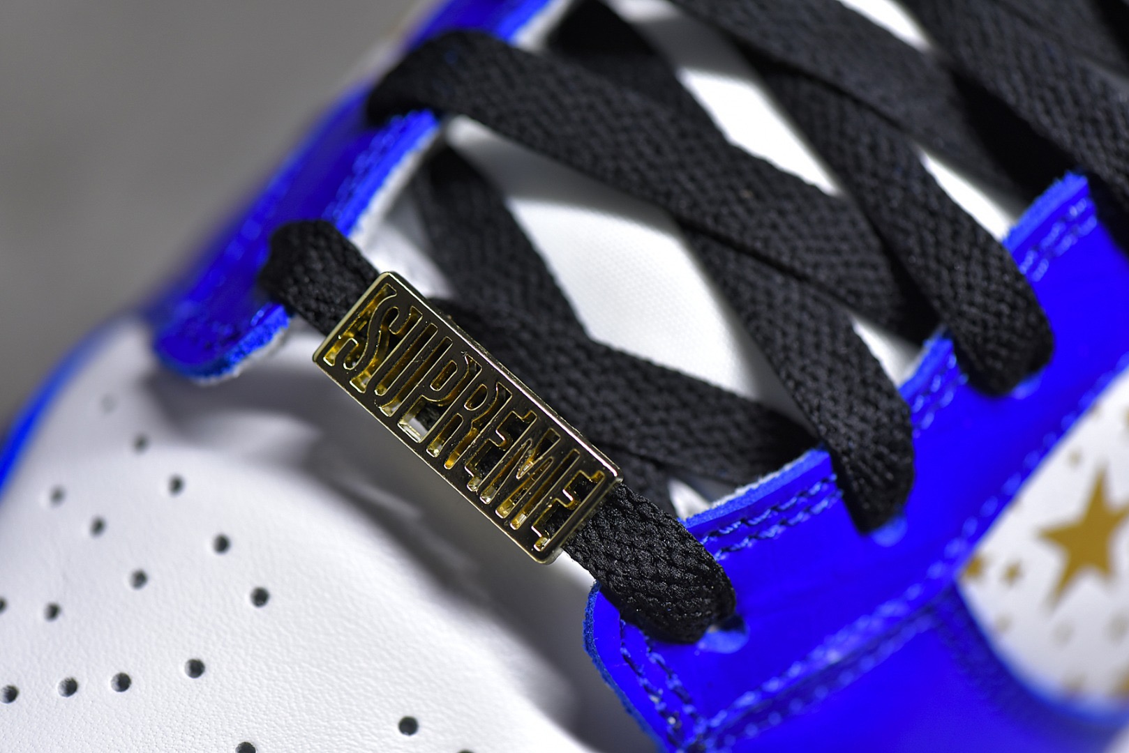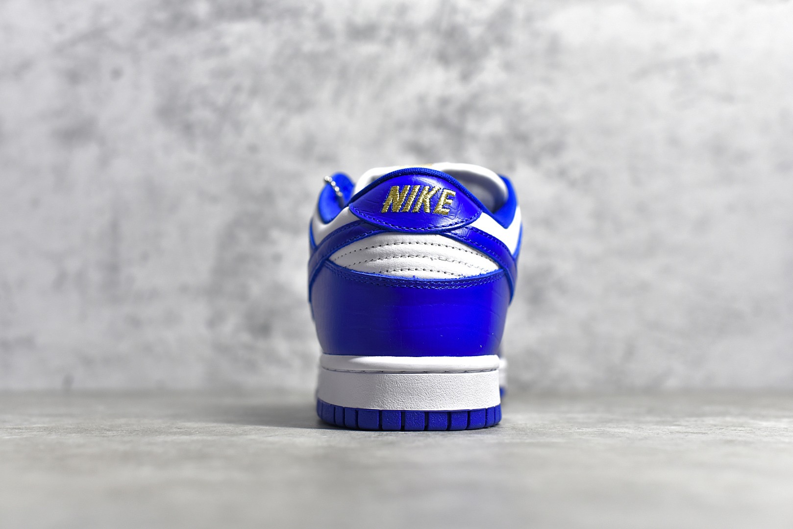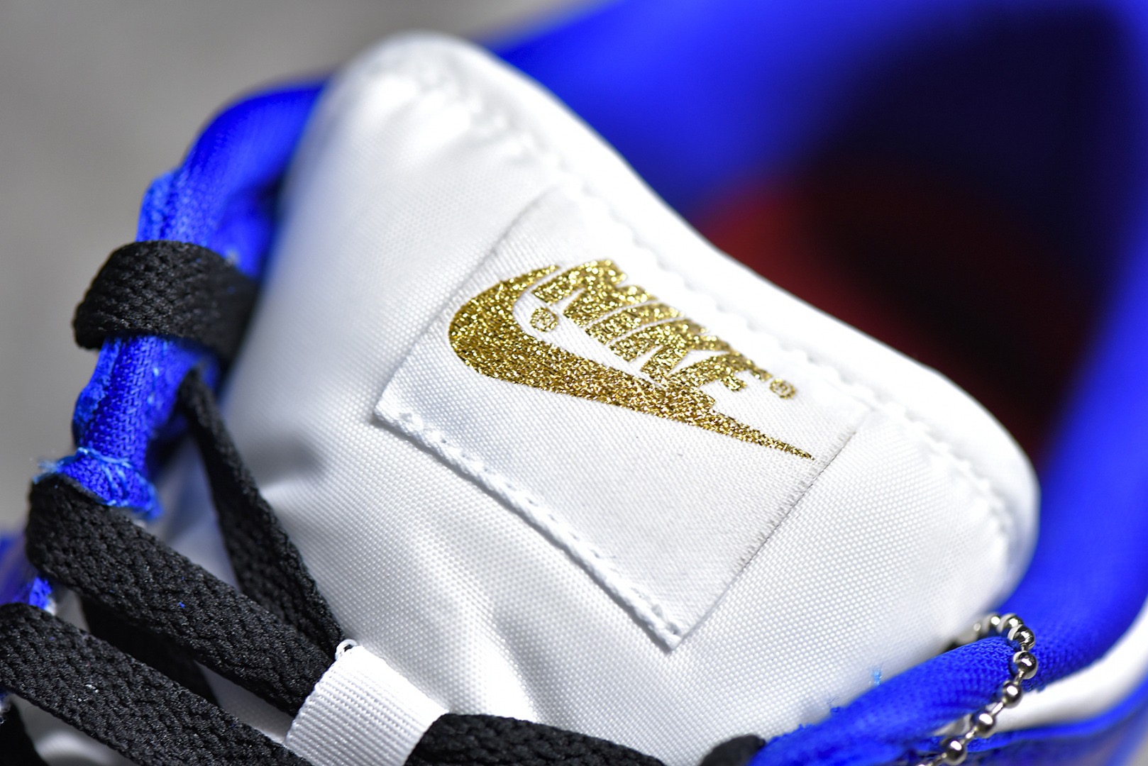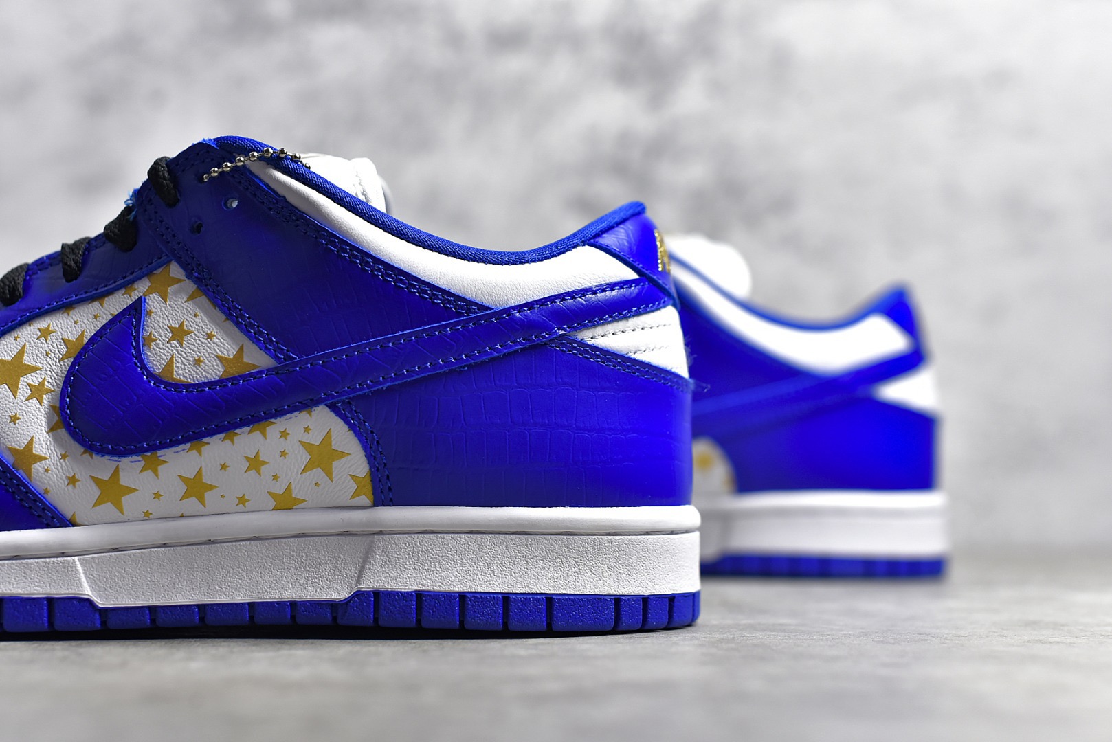 The SB Dunk Low Supreme Hyper Royal combines a bold Hyper Royal colorway with white and metallic gold accents. This sneaker features premium leather materials, Supreme star logo, Nike SB and Supreme branding, a padded tongue and collar, Zoom Air cushioning, and a durable rubber outsole for comfort and performance.